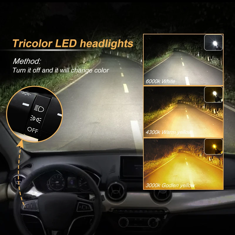 CNSUNNYLIGHT Car LED Fog Light Tricolors Switched H11 H8 9005 9006 H1 H3 12000Lm Bulbs 3000K 4300K
